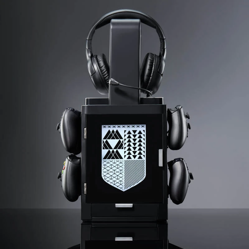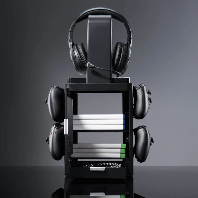This innovative, contemporary storage solution also features dedicated headphone and controller mounts, storage space located inside for up to 10 games, an integrated tray for your mobile devices and a drawer for any cables and accessories.Â