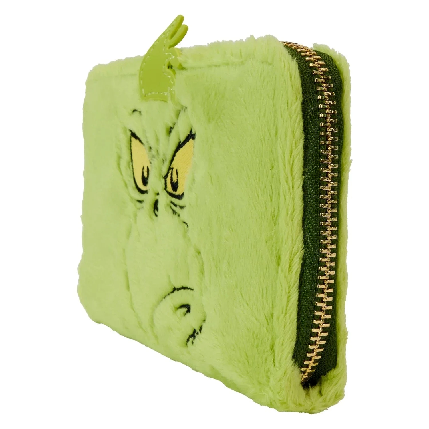 Inspire a warm and fuzzy holiday with this plush zip-around wallet, celebrating the Grinch in all his grumpy glory!