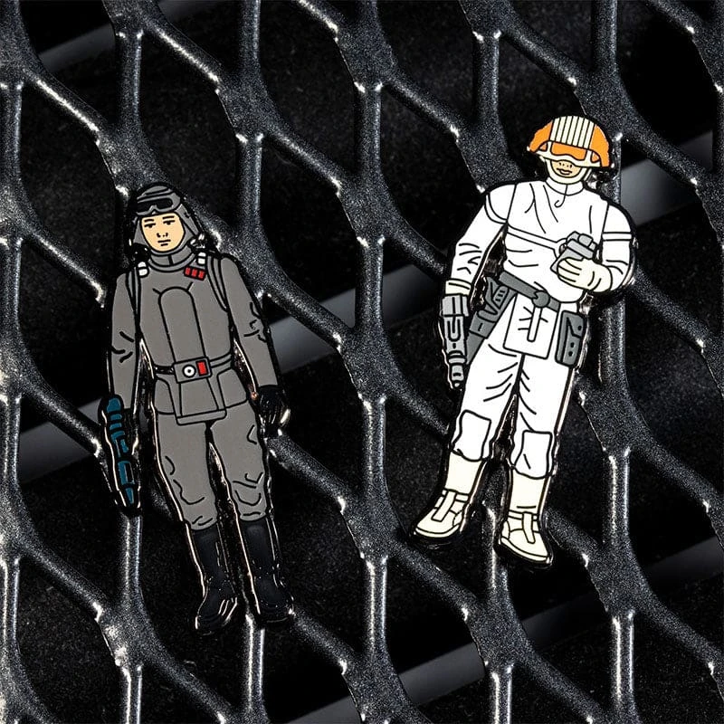 - Two premium quality hard enamel metal pins with a glossy finish featuring AT-AT Commander and Cloud Car Pilot on a backing card.